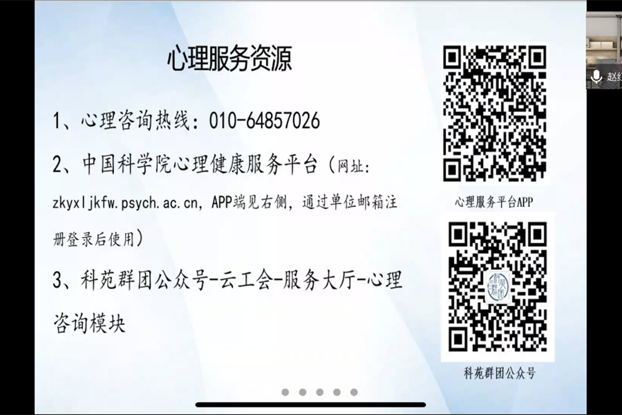 此次培训是中科院工会2021年职工心理健康主题巡讲的一部分,由中科院工会职工心理健康服务中心主办,脑智卓越中心工会承办。赵老师娓娓道来的授课方式,拓宽心路的课程内容让大家充满了正能量, “活在当下”的处世理念成功植入到了每位参与培训的职工心中。会后,职工纷纷表示将把所学知识运用到科研工作与日常生活中,在逆境中学会梳理心情,争取成为一个拥有阳光心态、主动提升人生幸福感的人。