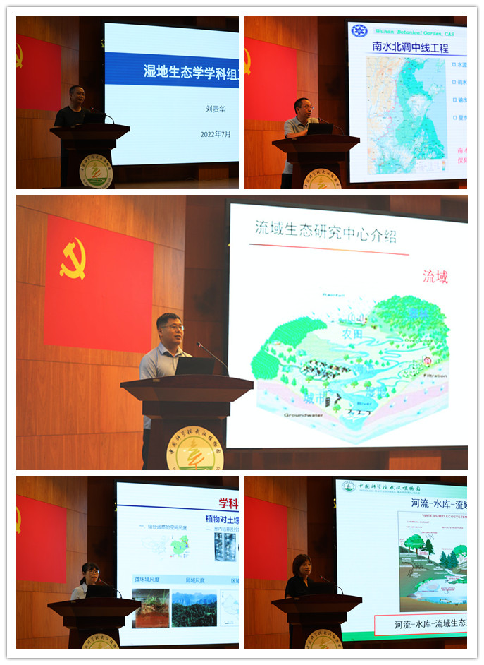 培训首先由流域生态研究中心主任刘峰研究员作报告。他从流域的宏观定位角度出发,报告了中心的科研团队和研究方向,希望发挥中心的科研力量,统筹山水林田湖草沙系统治理,实施好生态保护修复工程。同时他也介绍了自己带领学科组开展的科学研究工作。随后刘贵华、刘毅、左娟、叶琛几位老师分别报告了所在学科组的研究方向、科研团队、研究成果和发展规划。