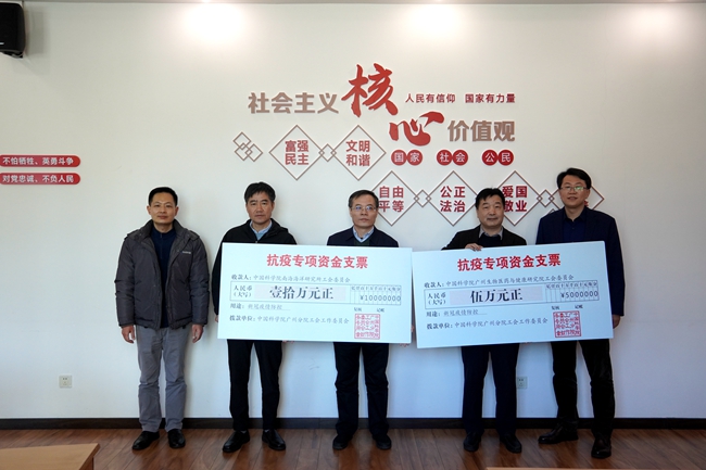 1月18日,中国科学院广州分院举行了简单的抗疫专项资金拨付仪式,广州分院分党组书记、院长陈广浩,副院长孙龙涛出席。中国科学院南海海洋研究所党委书记谢昌龙、中国科学院广州生物医药与健康研究院党委副书记侯红明分别代表本单位党委接过支票,并对广州分院分党组、广州分院工会工作委员会的大力支持表示感谢。