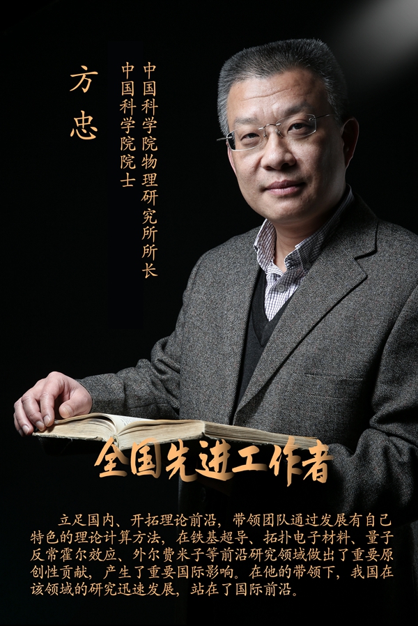 方忠研究员热爱科学事业,并为努力推动我国科学事业前沿探索,寻找创新超越的突破口。他主要从事于新奇量子现象与计算凝聚态物理方面的研究工作,是国际著名的凝聚态理论与计算物理学家。他立足国内、开拓理论前沿,带领团队通过发展有自己特色的理论计算方法,在铁基超导、拓扑电子材料、量子反常霍尔效应、外尔费米子等前沿研究领域做出了重要原创性贡献,产生了重要国际影响。他通过理论计算,预言了若干重要的量子效应和和量子材料,并被实验证实,引领了该领域的国际研究,并直接推动了相关实验研究的快速发展。在他的带领下,我国在该领域的研究迅速发展,站在了国际前沿。他的研究成果也被公认为国际上凝聚态物理研究领域为数不多的理论指导实验的典型范例。
