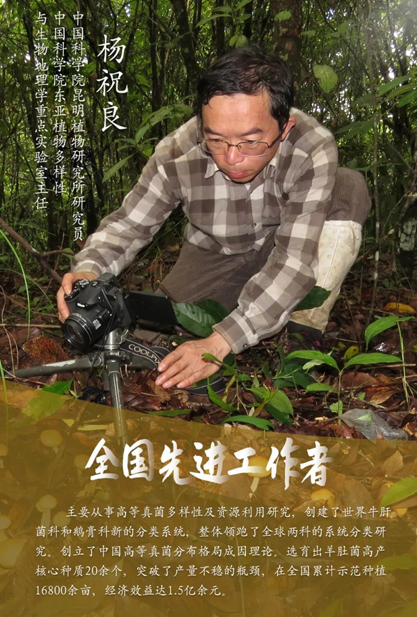 杨祝良,男,汉族,1963年6月出生,德国博士,研究员、博士生导师,主要从事高等真菌多样性及资源利用研究。现任中科院昆明植物研究所东亚植物多样性与生物地理学重点实验室主任。曾荣获全国五一劳动奖章、戴芳澜杰出成就奖、中科院优秀研究生指导教师奖和美国真菌学会荣誉会员奖。研究成果获云南省自然科学奖二等奖2项、广东省科学技术奖励一等奖1项。