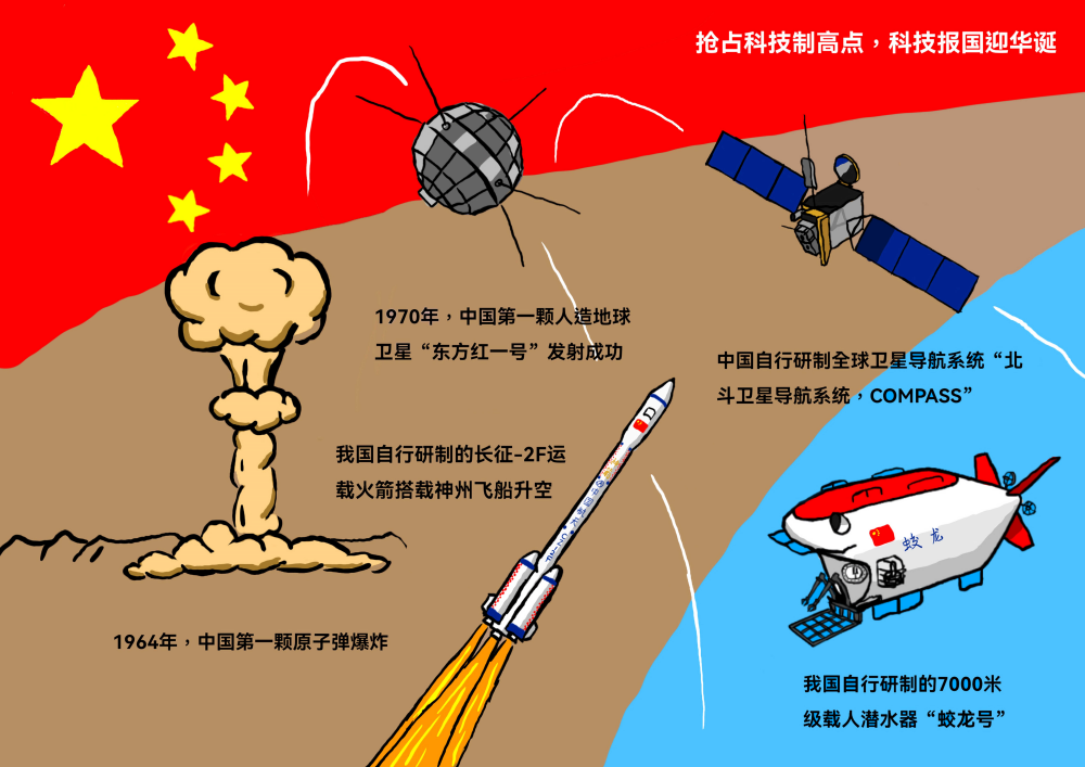 此绘画基于“抢占科技制高点,科技报国迎华诞”绘制,展现了建国建院以来在不同领域的重大科研突破,标志着我国科技迈入世界先进行列,抢占世界科技制高点,以此画庆祝建国建院75周年。