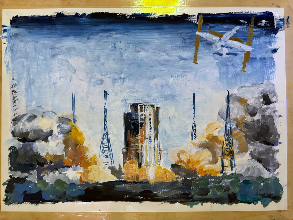 画面通过描绘长征五号运载火箭发射升空的瞬间,展现了我国科技水平在党的领导下,不断刷新着自立自强的新高度、新成果。画面右上方隐现中国空间站完整体图像,更加深刻的印证了我国在从航天大国向航天强国道路上的脚步,越走越远。