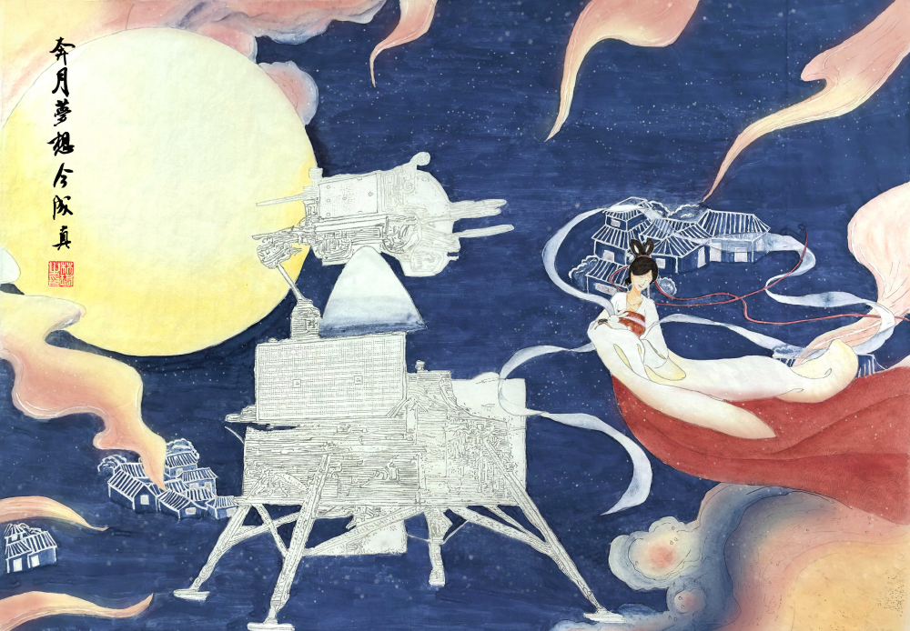 绘画用深邃的太空,皎洁的明月,体现了中国人对太空的无限想象,嫦娥和月球车即体现了中国几千年的文化传承及科技的成就,也突出表现了中国在航天领域的突破将层出不穷,如同繁星闪烁,点亮人类探索太空的无限梦想。