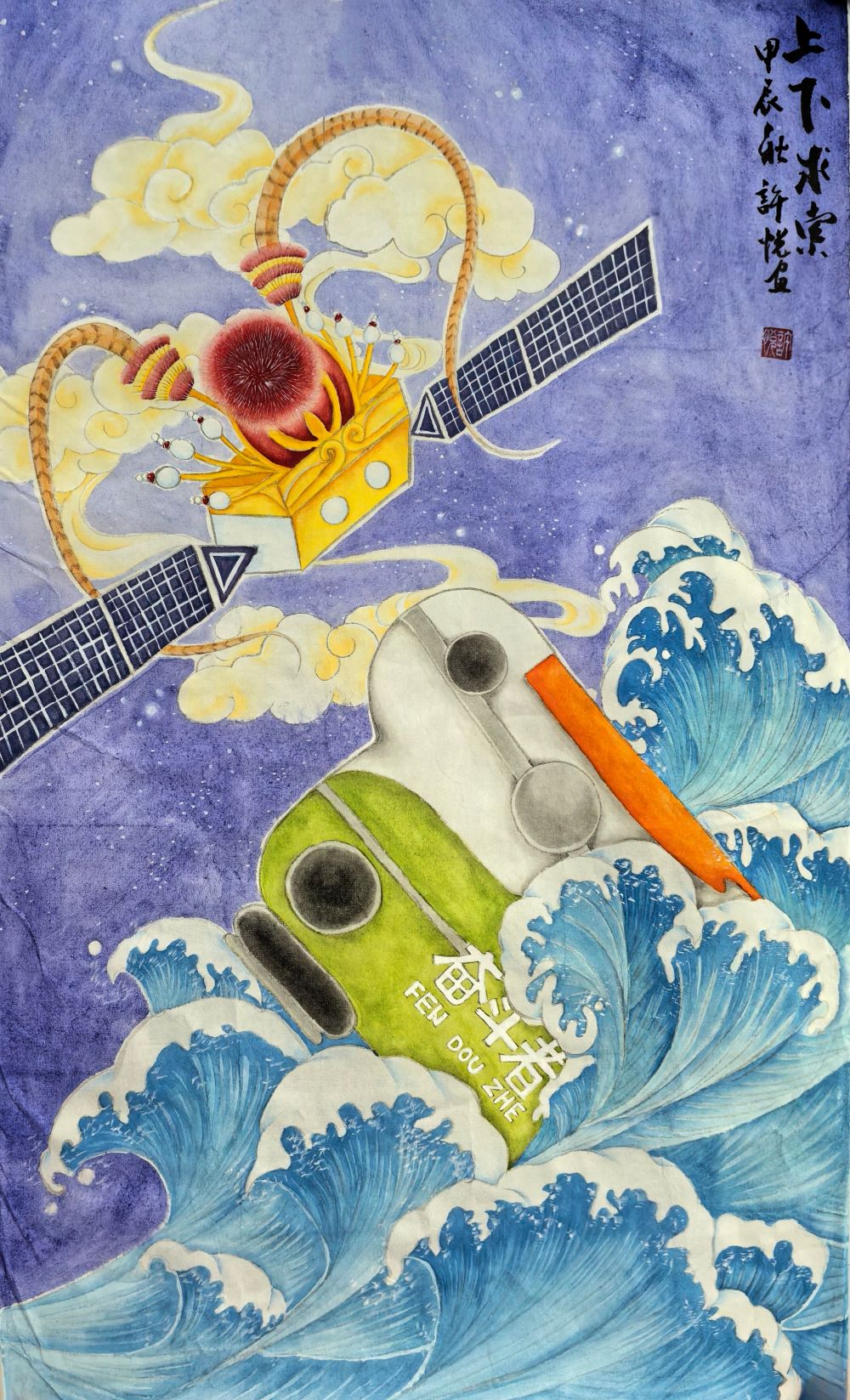 该作品以暗物质粒子探测卫星“悟空”号和“奋斗者”号全海深载人潜水器为创作主体,融合了国画取物形意的特点,让“悟空”号乘金色祥云遨游天际、“奋斗者”号逐波踏浪游历大洋,体现了中国科学院在实现“可上九天揽月,可下五洋捉鳖”的愿景的过程中,不断勇攀高峰、上下求索的科学精神。