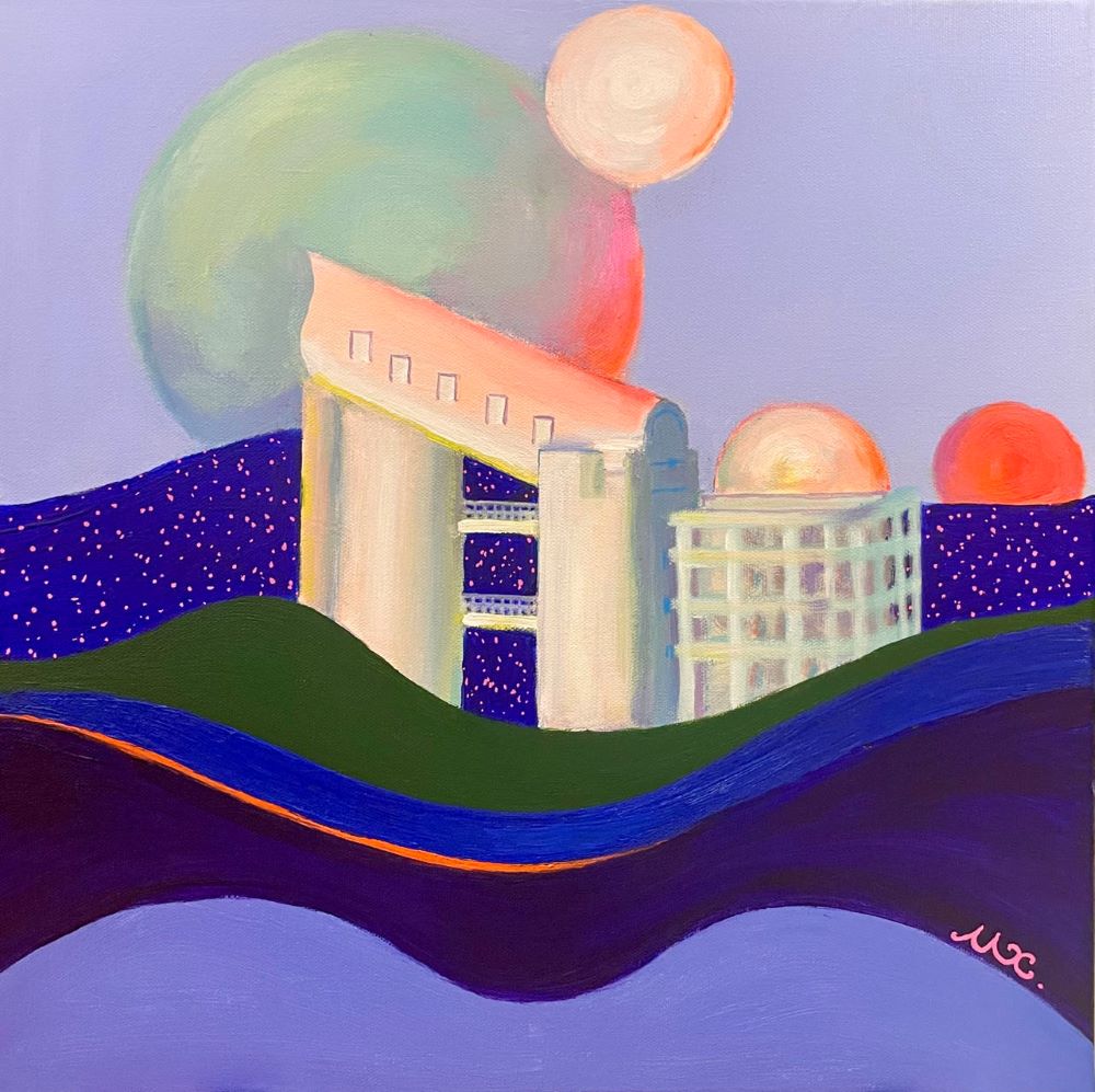 作品是以中科设计的代表作品国家天文台LAMOST天文望远镜为背景的创意丙烯画。画面假定在异世界的超时空空间里,几何形建筑与几何球体呈现出强烈的未来感。LAMOST天文望远镜伫立在漂浮着星球的背景画面中。整个空间有被观测物的意向,对比刚烈的多巴胺配色则表现了现代艺术的活泼能量。通过此幅作品祝愿伟大祖国在探索宇宙的远大历程中有更大突破,稳拿科技制高点,在科技发展中更创高峰。