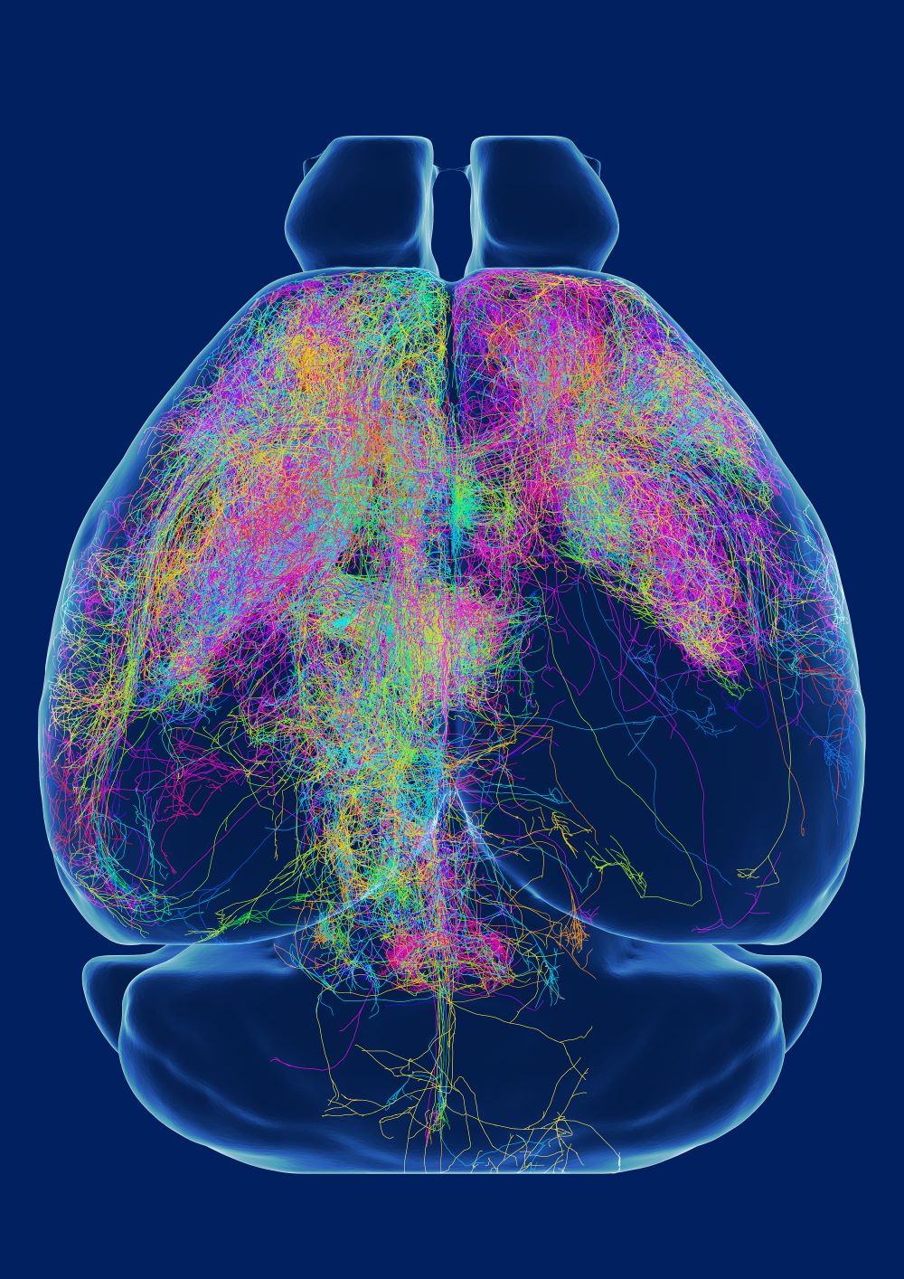 2024年,脑智卓越中心,图片是小鼠前额叶皮层投射神经元的全脑轴突投射图谱。前额叶皮层负责大脑高级功能,其神经元广泛投射到多个脑区。脑智卓越中心在国际上首次绘制了超过6000个前额叶皮层单神经元形态数据,为精细解析大脑功能提供了重要的结构基础。