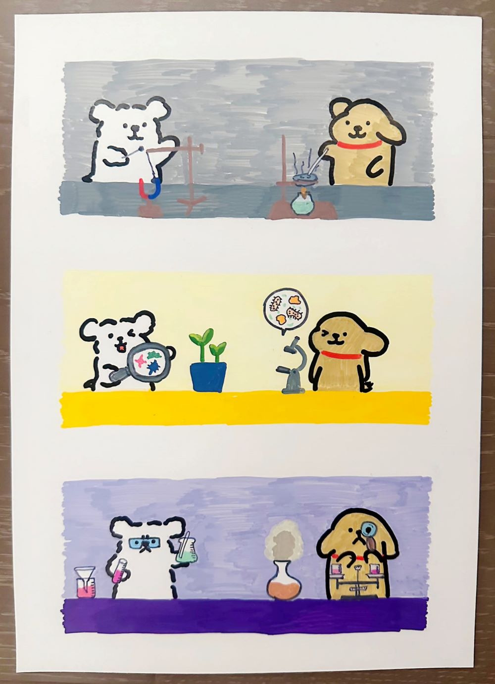 “线条小狗”最初作为社交软件的表情包出现,随后迅速走红,并发展成为全球知名的文创IP。作品绘制了线条小狗做科研的场景,分别是物理小狗、生物小狗和化学小狗,通过可爱生动的卡通形象,鼓励更多年轻人从事科研,投身抢占科技至高点的队伍。