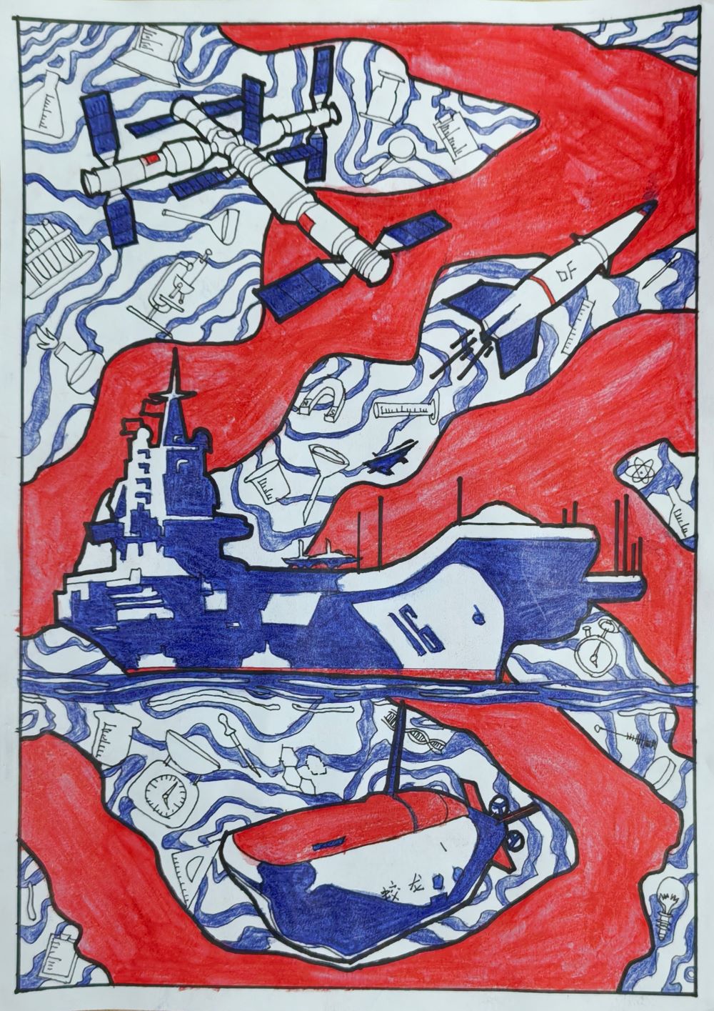 “天宫”与“东风”傲立苍穹;航空母舰雄踞海面;“蛟龙”潜艇深潜;“75”字样铺满纸张;一些基础实验工具零散在各处。共同构成了一幅我国科技创新和力量崛起的生动图景。