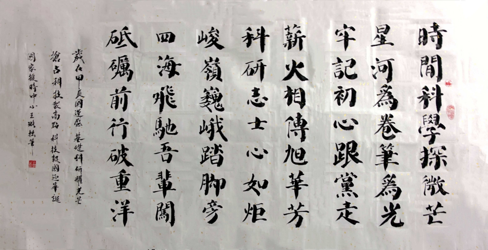 时间科学探微芒,星河为卷笔为光。 牢记初心跟党走,薪火相传旭华芳。 科研志士心如炬,峻岭巍峨踏脚旁。 四海飞驰吾辈闯,砥砺前行破重洋。 体现了国家授时中心科研工作者以初心为引,薪火相传,砥砺前行,勇攀峻岭,无惧挑战,誓破科研壁垒的新时代科学家精神。