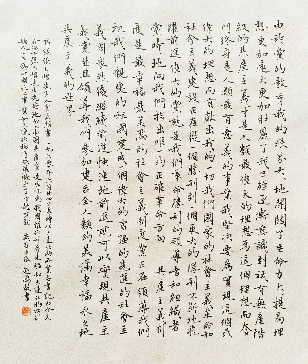 ——节录张大煜先生入党志愿书。1960年6月24日,在大连化物所时任党委书记白介夫介绍下,张大煜先生光荣地加入中国共产党,先生作为我国催化科学先驱和大连化物所创始人,一生为中国化学化工事业和大连化物所的发展做出了卓越贡献。岁在甲辰,冠鸿敬书。"