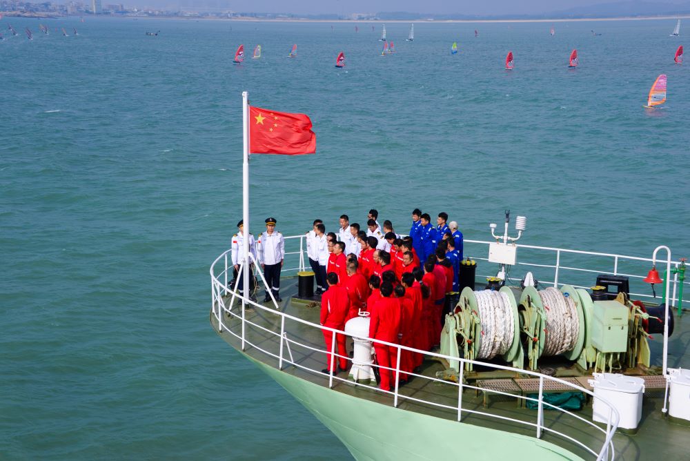 水声物理研究团队在南海海域开展跨年实验,元旦当天举行升国旗仪式,迎来新年的第一缕曙光。
