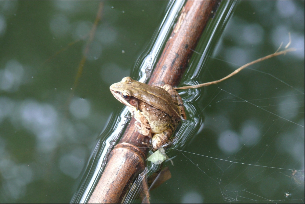 崔建国拍摄的趴在池塘水面竹竿上的仙琴蛙