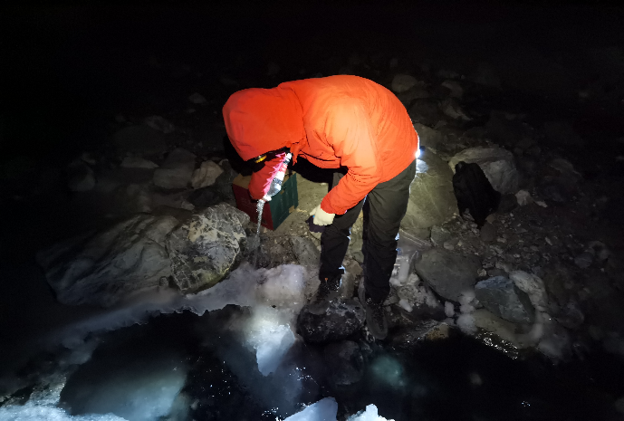 检查好巨大双肩包里的采样瓶、记录本、便携式水质仪、流速仪和小型气象监测设备,我们开始前往冰川融水汇流处。停车点距离汇流处的不算太远,但全程是由巨石和碎石组成的斜坡,有的石头上还结了薄冰,穿着雨鞋并不好走。脚下的碎石不时滑动,加上头灯照明范围有限,落差比较大的地方,需要手脚并用爬下去。20分钟后,我们到达了预定的观测点。由于夏季冰川消融非常强烈,站在很远的地方就能听到水流在黑暗中的咆哮声,让人有种“乱石穿空,惊涛拍岸,卷起千堆雪”的感觉。我们迅速架起各种仪器,在选好的融水断面测量流速、水质。融水冰冷刺骨,拿着采样瓶的手从疼痛逐渐变得麻木。每隔两小时,需要采集一次水样并检测pH值、盐度、电导率、溶解氧等水质参数,对于更复杂的水质成分分析,需要将样品运回实验室才能检测,以捕捉水质的日变化规律。