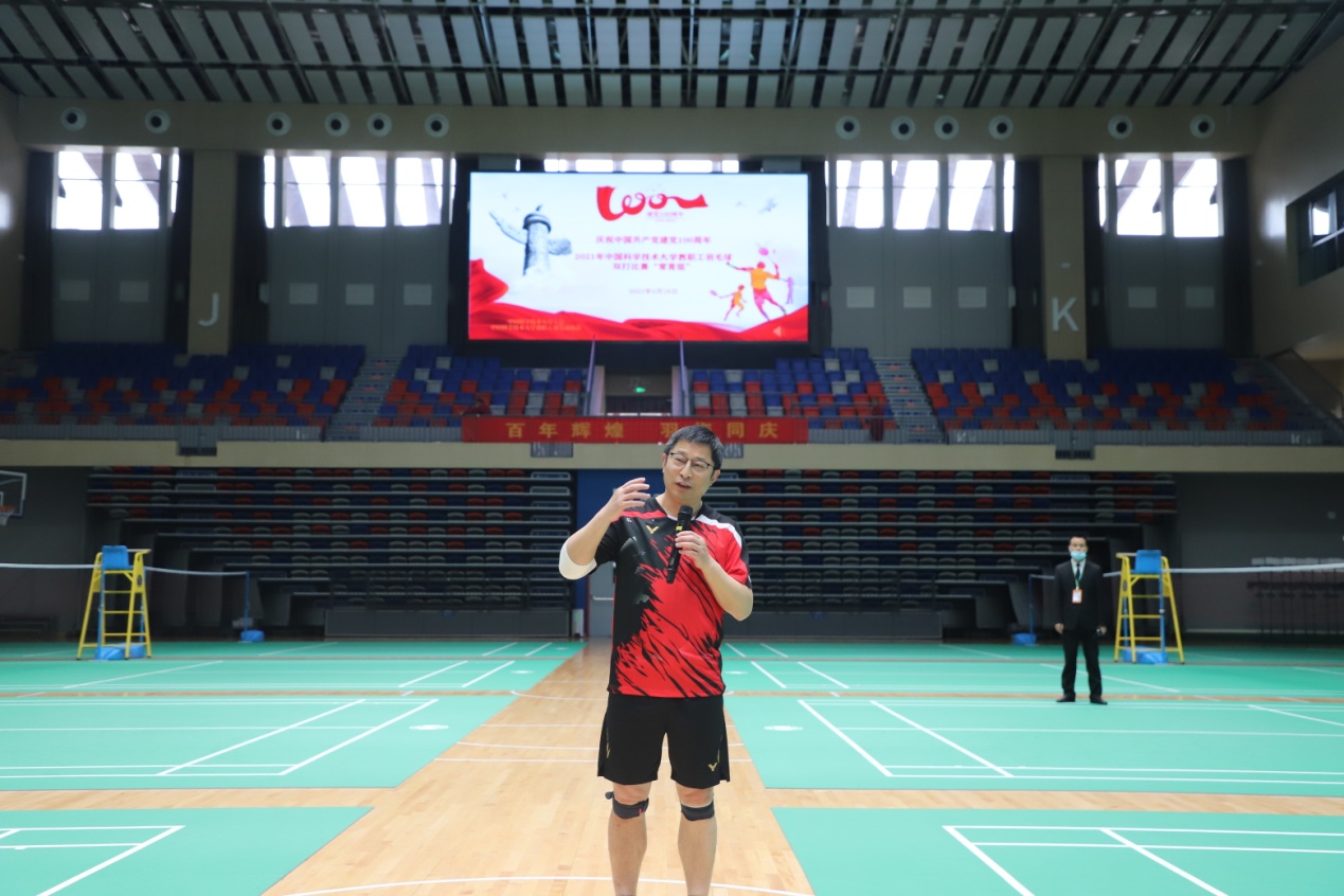 校长助理、教务长、教工羽协会长周丛照在开幕式上讲话,他指出教工羽协经过不断发展,现在已经成为学校第一大协会,极大地调动了广大教职工参与羽毛球运动的积极性。希望选手们尊重裁判,尊重对手,赛出风格、赛出水平。对外联络与基金事务处处长、教育基金会秘书长周宇表示基金会将大力支持教职工文体活动开展以及学校体育场馆建设,希望教职工们快乐生活、快乐工作、快乐运动。校工会副主席朱文婧代表工会感谢教工羽协为全校羽毛球爱好者提供了交流技艺、切磋水平的平台,感谢对外联络与基金事务处、华米科技对本次活动的大力支持。朱文婧指出,本次比赛,是校工会组织开展的庆祝建党100周年系列活动中文体协会组织的首场活动。近年来,校工会一直通过组织各种形式的活动努力让更多教职工,特别是教学科研一线的教职工参与运动,收获健康,共享快乐,全方位提升教职工的幸福感,获得感和满足感。希望教工羽协等协会能够充分发挥平台作用,让更多的教职工参与运动,丰富教职工的业余文化生活,增强身体素质,通过组织开展各类比赛活动,交流经验、增进团结、凝聚人心,营造健康校园的氛围。出席开幕式的还有华米科技联合创始人兼副总裁章晓军等。开幕式由教务处副处长、教工羽协秘书长吴强主持。