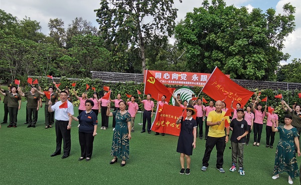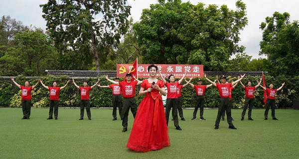 5月23日上午,为庆祝建党百年华诞,园艺中心党支部与广州八一艺术团在华南植物园游览区温室稀树草坪广场联合举行主题为“同心向党、永跟党走”的庆祝建党百年文艺汇演,节目表演以八一艺术团为主,园艺中心党支部参与了《没有共产党就没有新中国》《我和我的祖国》的大合唱。尽管适逢周末,但是为了组织好这次活动,园艺中心大部分党员积极参与其中,或参加合唱或作啦啦队员摇旗呐喊。此次活动园艺中心党支部有30多名党员参加,广州八一艺术团有60多人参加,共计100余人。华南植物园党委副书记/纪委书记徐海出席并致辞,园艺中心副主任/党支部书记夏汉平领队参加活动并作发言。
