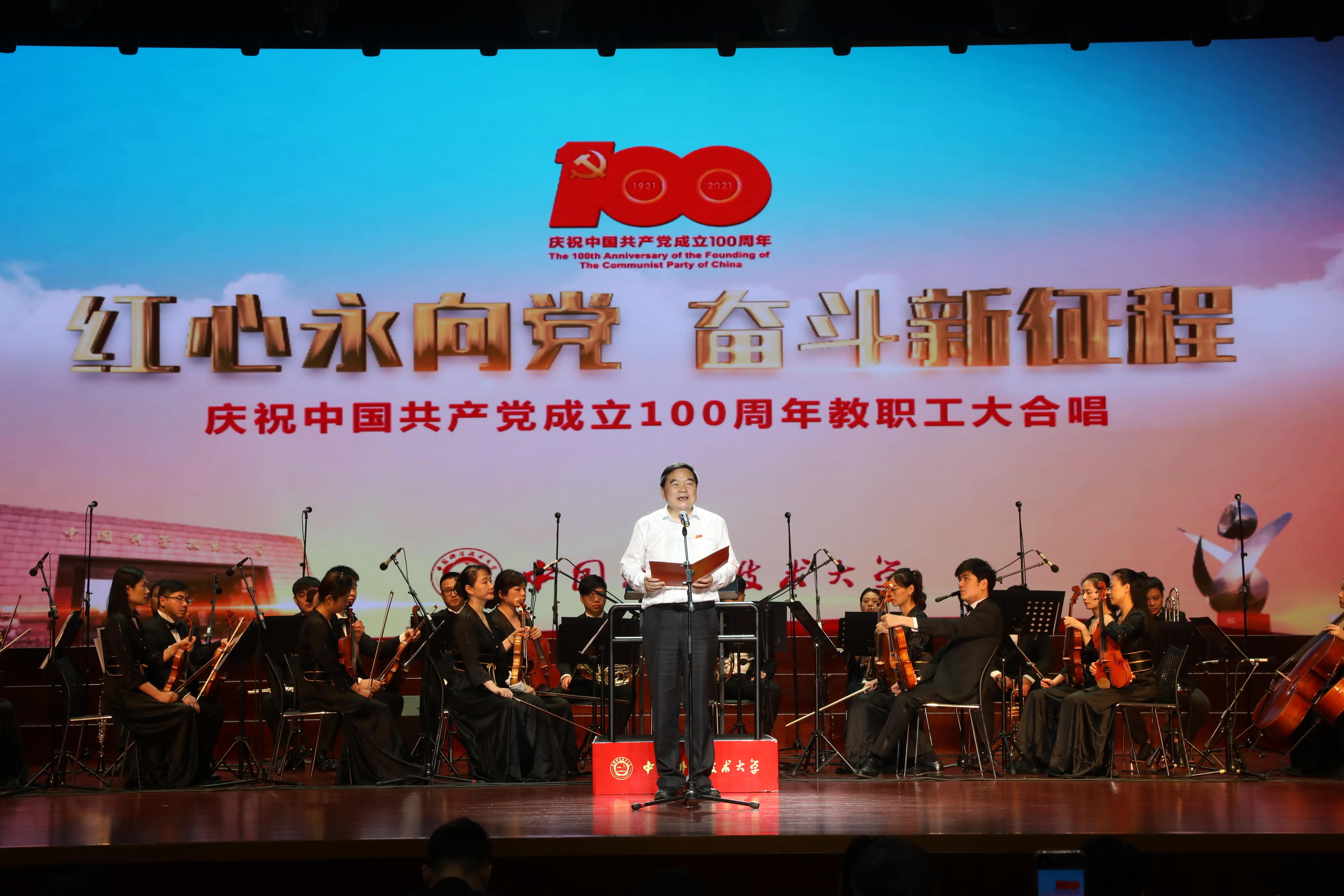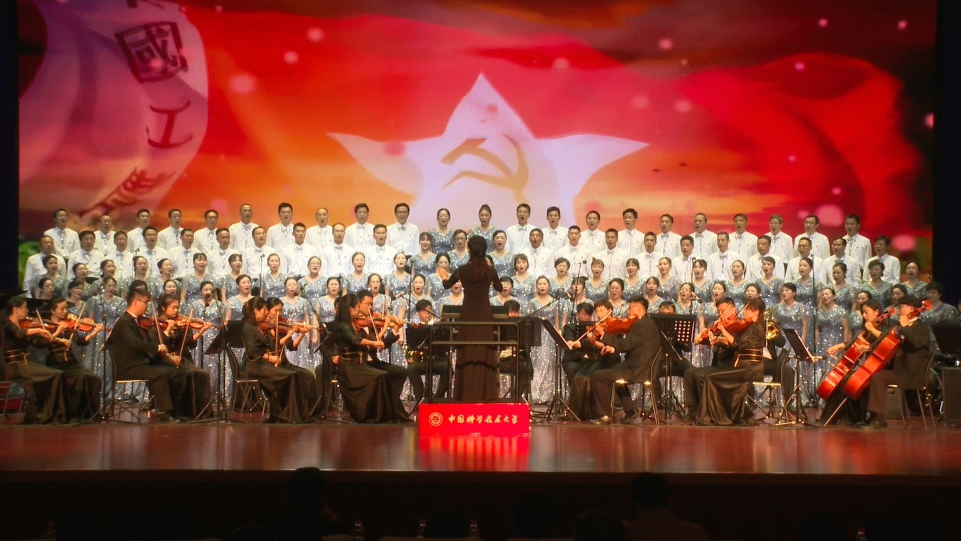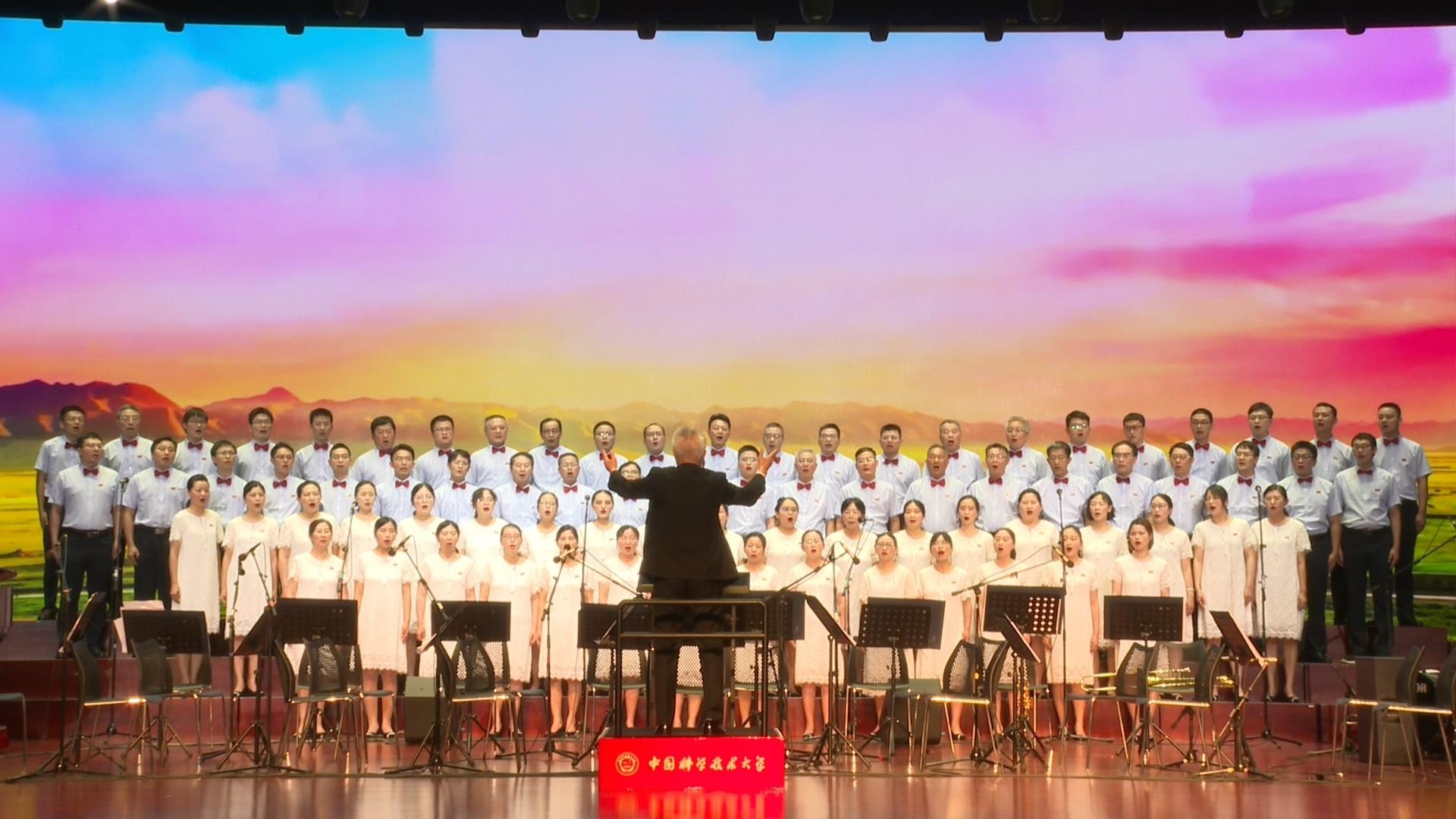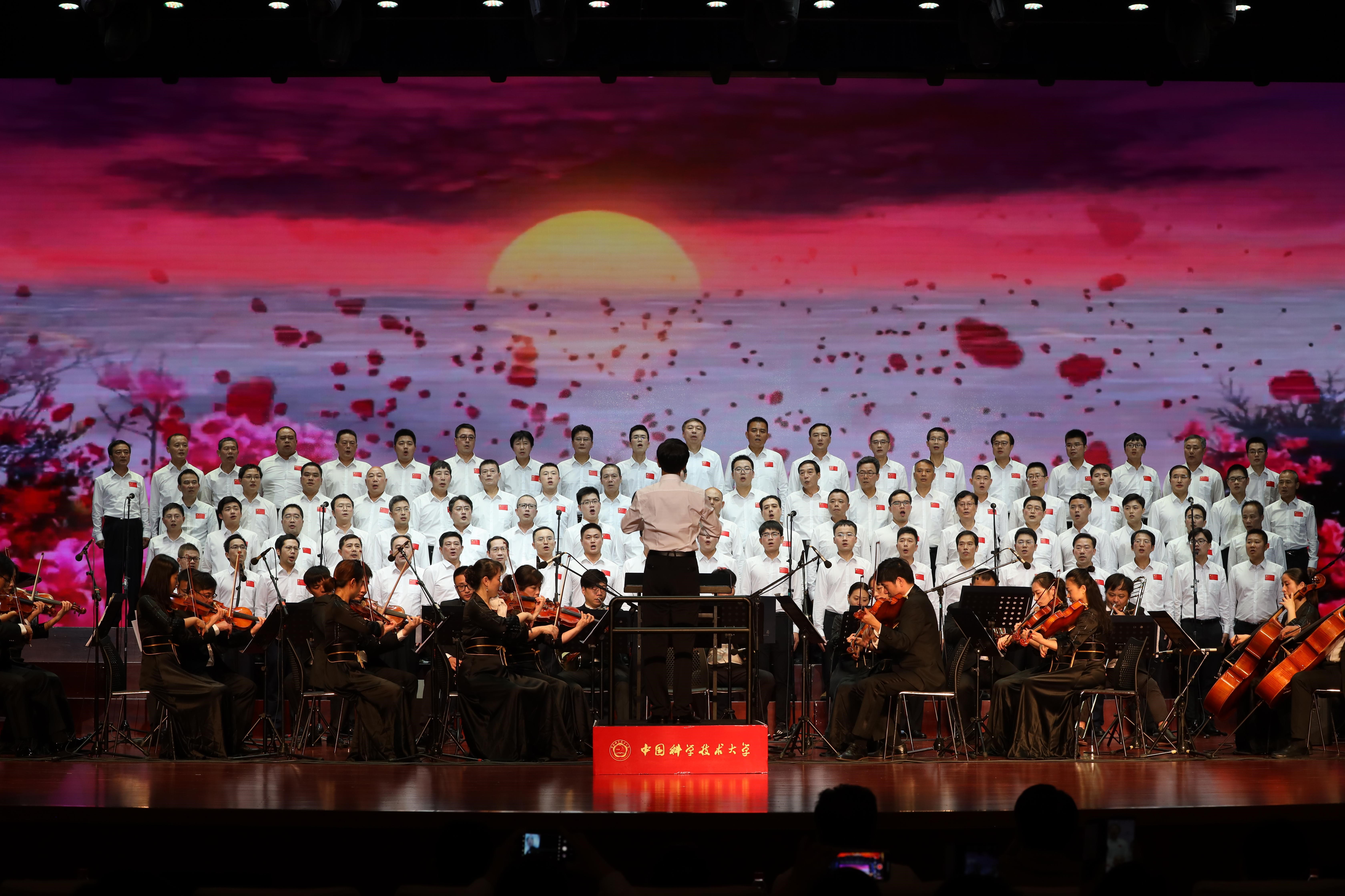 校机关、少年班学院和资产经营有限公司组合的机关男队和机关女队声情并茂地演唱了《不忘初心》《唱支山歌给党听——再唱山歌给党听》《珊瑚颂》《灯火里的中国》等曲目,舒歌群等多位校领导也在队伍中同大家一起高唱。在舞台的大屏幕上,科大参与的多个国家重大科技创新项目画面不断闪现,热烈的气氛感染了现场每一个人。