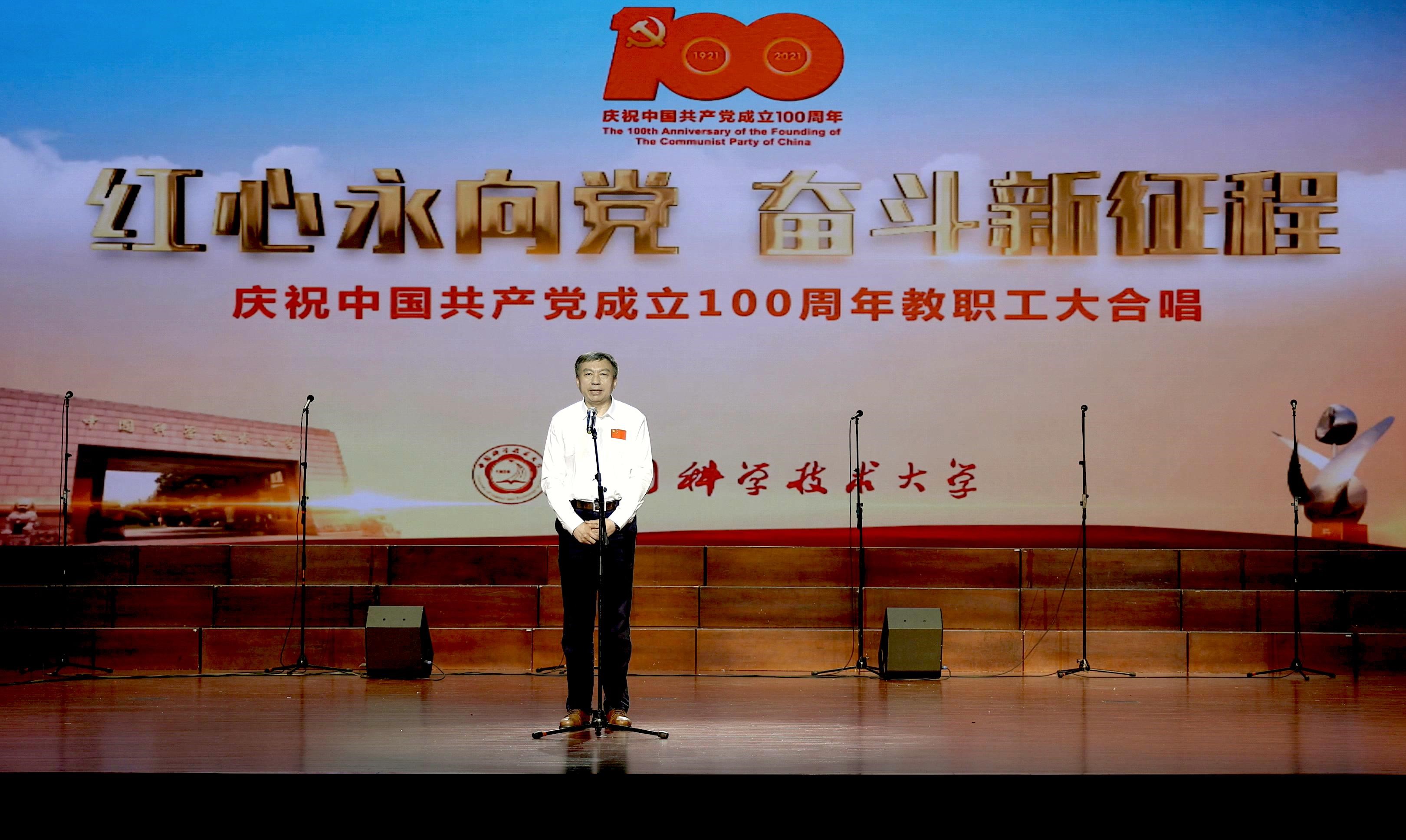 包信和在致辞中表示,教职工合唱大赛是“永远跟党走”系列主题宣传教育活动的一部分,各支参赛队伍以红歌礼赞建党百年,弘扬革命精神。百年征程风正劲,千帆竞发展雄姿。中国科大校歌《永恒的东风》也是一首红歌,激励着一代一代科大人把红旗插上科学的高峰。希望广大师生永攀科学高峰,在新时代唱响“科大红歌”,以优异成绩迎接中国共产党百年华诞。