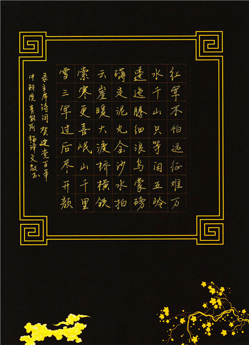 作品简介:摘录毛泽东主席的《七律·长征》红军不怕远征难,万水千山只等闲。五岭逶迤腾细浪,乌蒙磅礴走泥丸。金沙水拍云崖暖,大渡桥横铁索寒更。喜岷山千里雪,三军过后尽开颜。