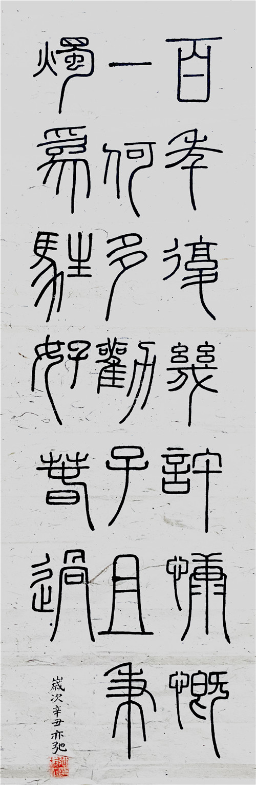 作品简介:摘自清代张惠言《水调歌头》,以汉篆风格创作,线条充满生命的活力,结构严谨疏朗,姿态优美飘逸,具有丰富的意蕴。表达了中国共产党百年历程是筚路蓝缕、艰苦创业的百年,是苦难中铸就辉煌、奋斗后赢得未来的百年。