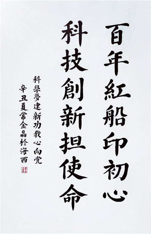 作品简介:习近平总书记指出:“长期以来,一代又一代科学家怀着深厚的爱国主义情怀,凭借深厚的学术造诣、宽广的科学视角,为祖国和人民作出了彪炳史册的重大贡献。”本作品以传统书法的形式,讴歌了新一代科技工作者们“不忘科学报国初心,牢记科技强国使命”的宝贵精神。