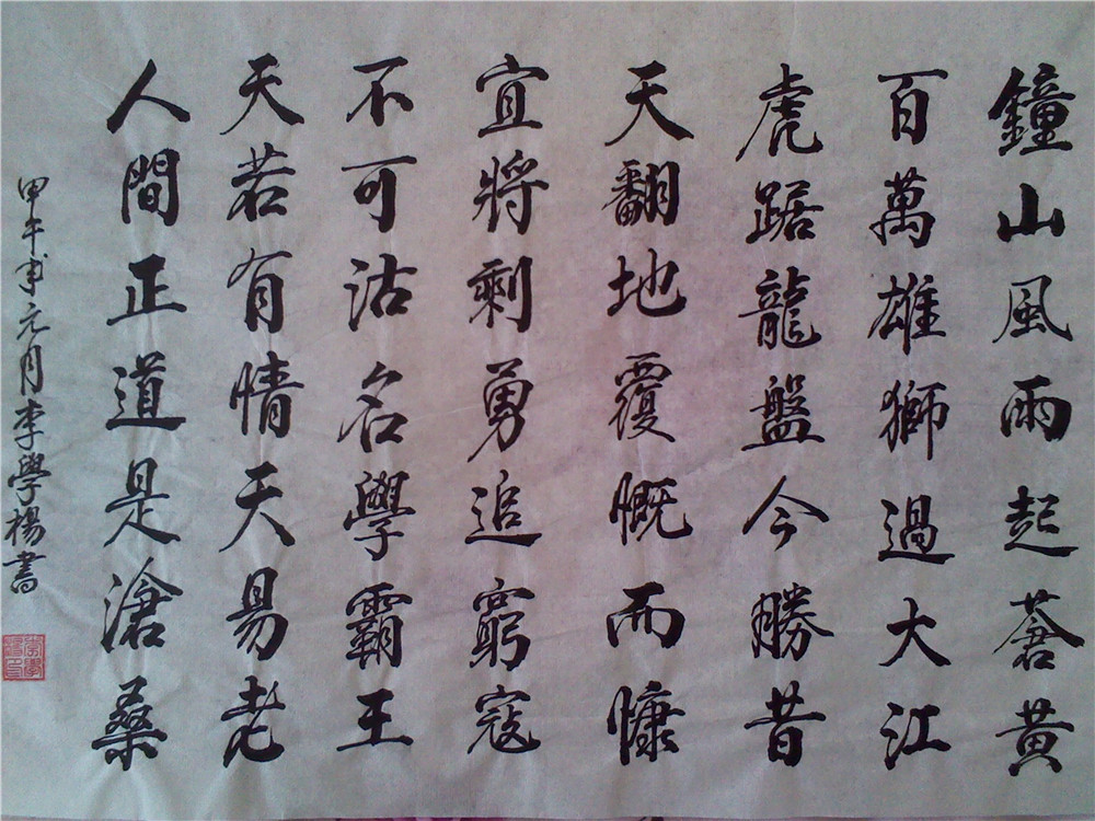 作品简介:出自毛泽东同志于一九四九年四月所写的诗《七律·人民解放军占领南京》。整首诗不仅描述了解放军占领南京这一伟大的历史事件,揭示了它的重大意义,穷尽了理、事、情;而且还显示了诗人的高瞻远瞩、雄才大略,表现了诗人的才、胆、识、力。正是“以在我之四衡,在物之三合,而为作者之文章”。