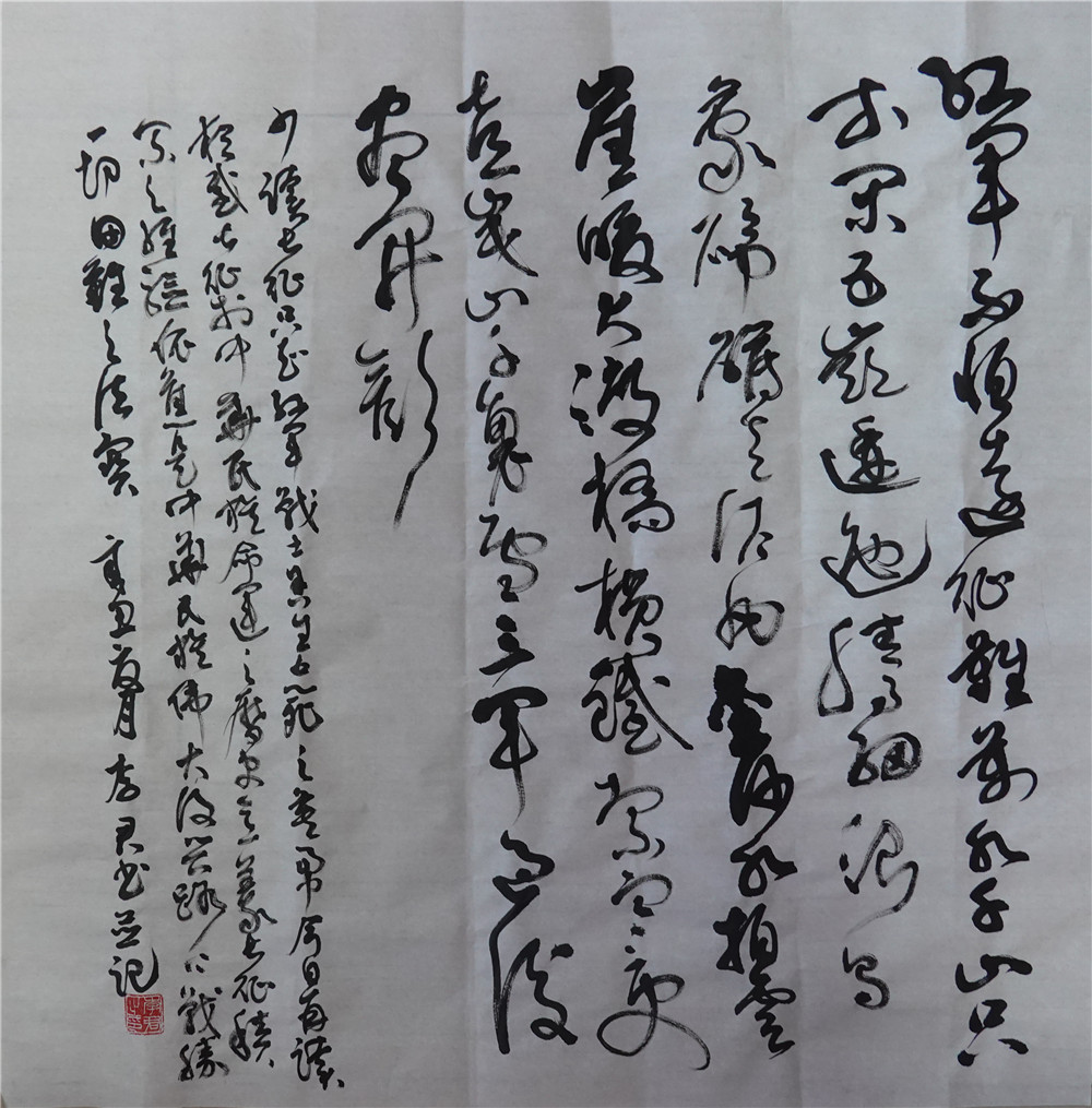作品简介:少读长征,只知红军战士舍生忘死之英勇。今日再读,尤感长征于中华民族命运之历史意义。长征积累之经验,依旧是中华民族伟大复兴路上战胜一切困难之法宝。创作于2021年5月23日深夜。四尺对开斗方,草书毛主席七律《长征》,正文后附作者学习中国共产党党史小记。创作材料:羊毫、半生宣、一得阁墨汁。辛丑夏月,李君书并记。