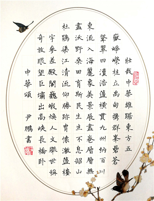 作品简介:此作品通过节选新时代题材诗歌和采用近现代书写工具,来弘扬传统书法艺术。文字内容摘自《中华颂》,原作为庆祝建国六十周年而作的词赋书法作品,赞美了祖国大好河山和华夏民族文化。