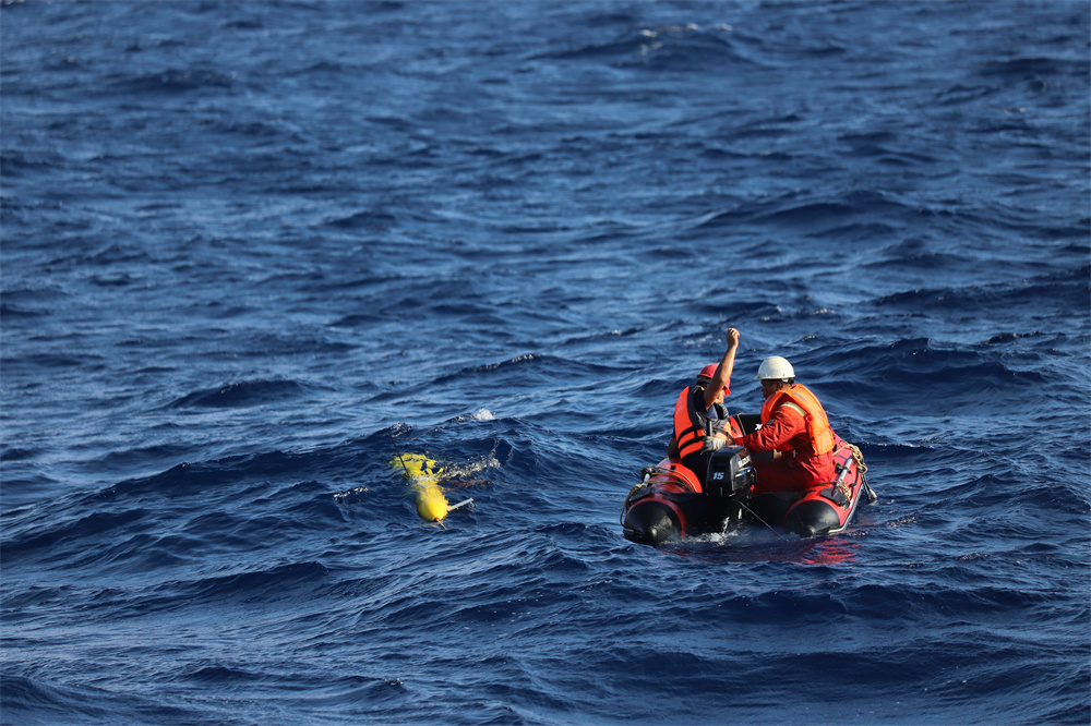 作品简介:航次即将结束海试任务也逐渐接近尾声,在繁多的科考任务中今天再一次开展设备回收工作,船队员开着小艇缓缓的向目标接近。在海上,船员与科考队员各司其职又互相配合,共同确保科考工作的顺利开展,在最蓝的大海中扬帆起航,做征服大海的勇士。图为回收“海翼”号水下滑翔机场景