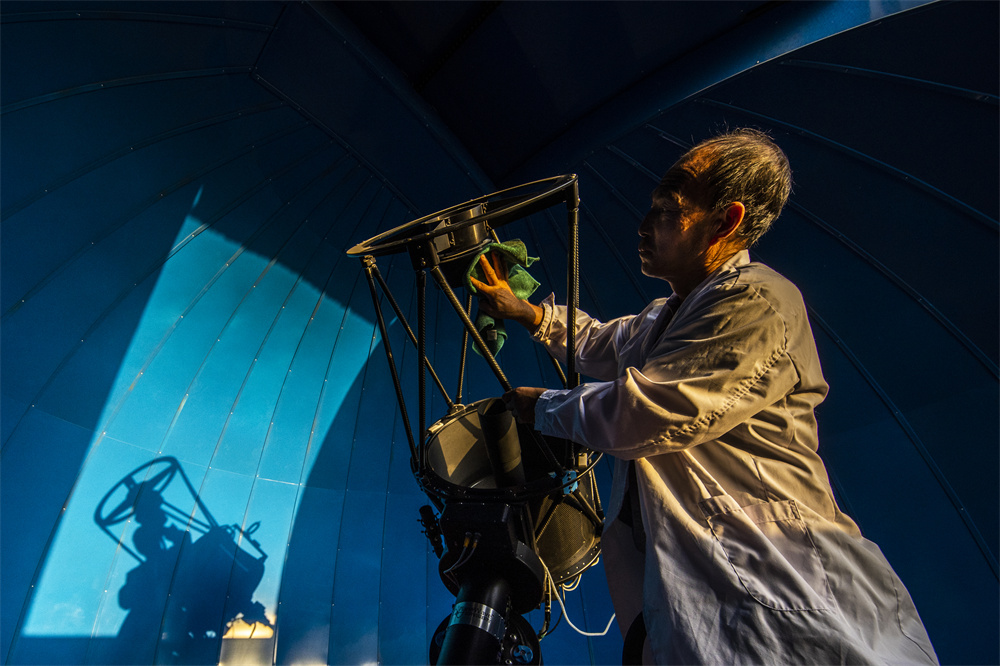 作品简介:陕西天文台骊山天文站建于1988年,是用于天文观测的重要基地。本照片拍摄于天文观测站的射电望远镜观测室,傍晚时分,在晚霞的映照下,长期驻守于天文站的老师傅正聚精会神地擦拭射电望远镜,为科研人员做好保障,在平凡的岗位上默默无闻地付出。