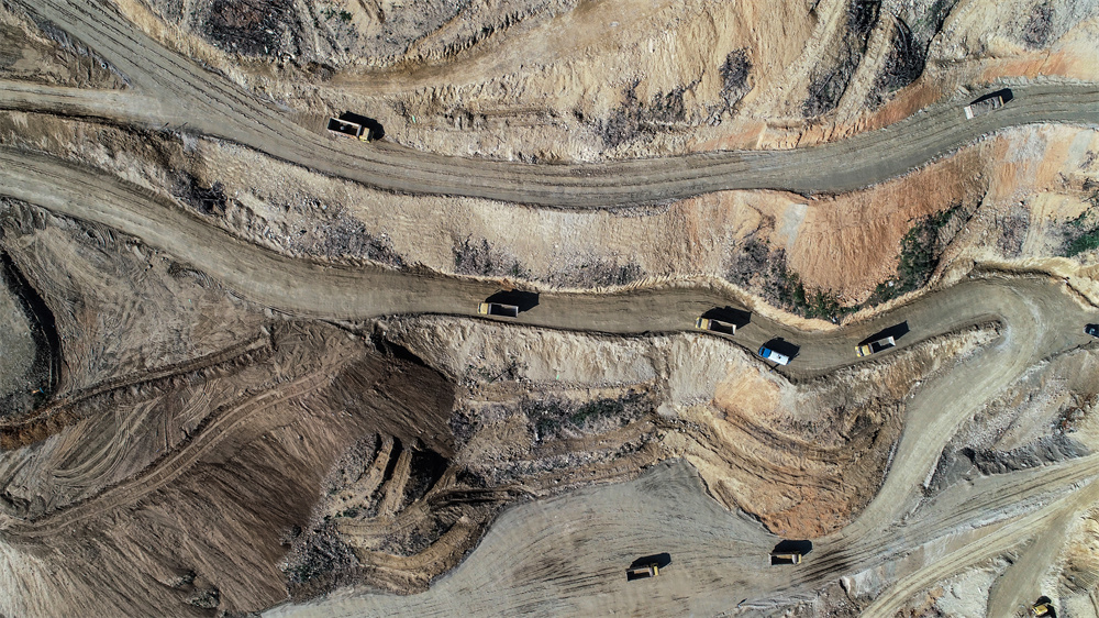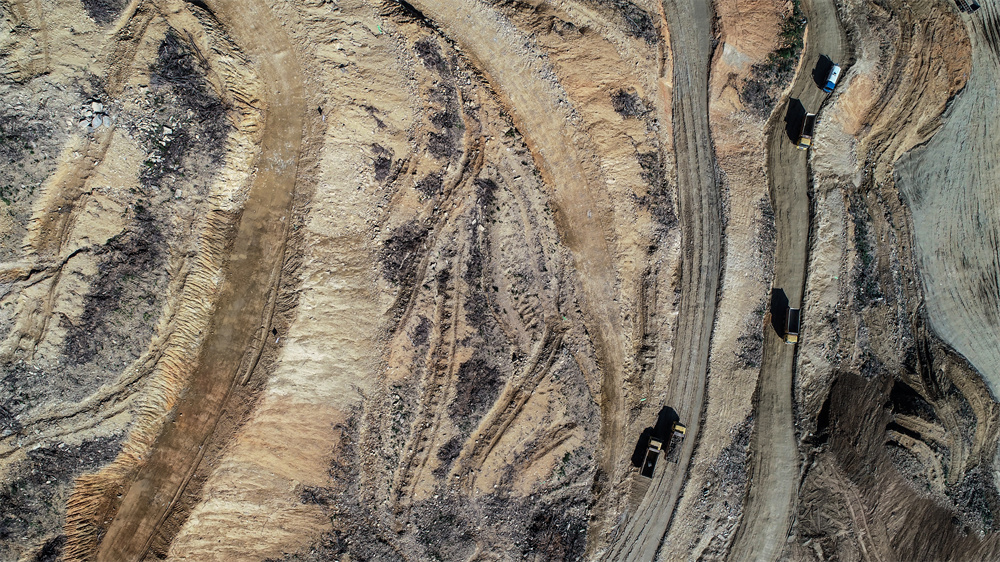 作品简介:科学之路:土石方工程初期,俯瞰装置区施工现场,一辆辆施工卡车走出蜿蜒曲折的路径,且显得十分渺小,象征科学世界的广袤和科学之路的艰辛曲折。