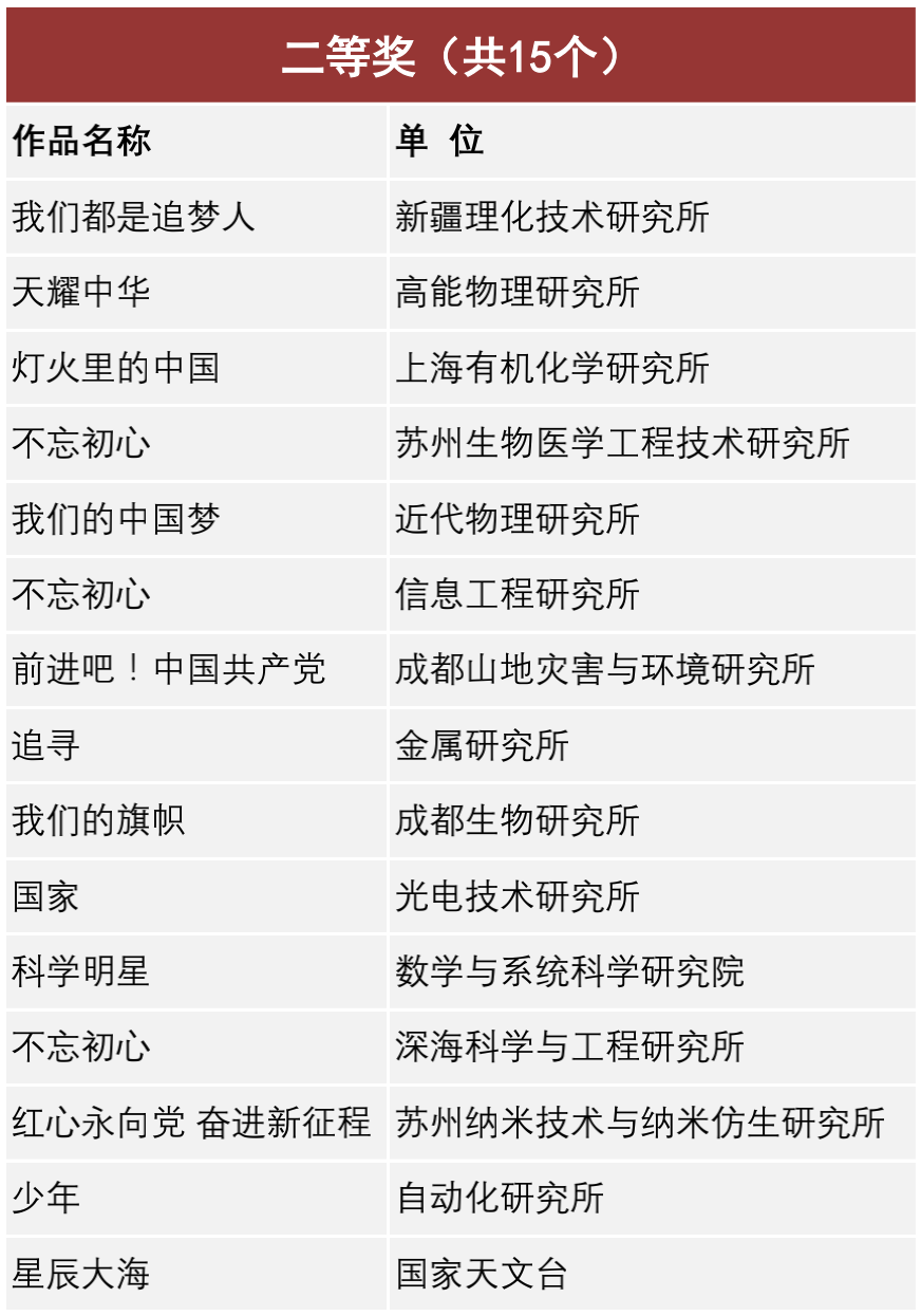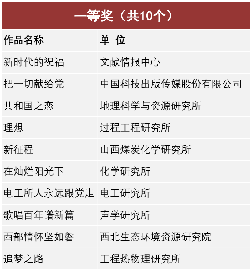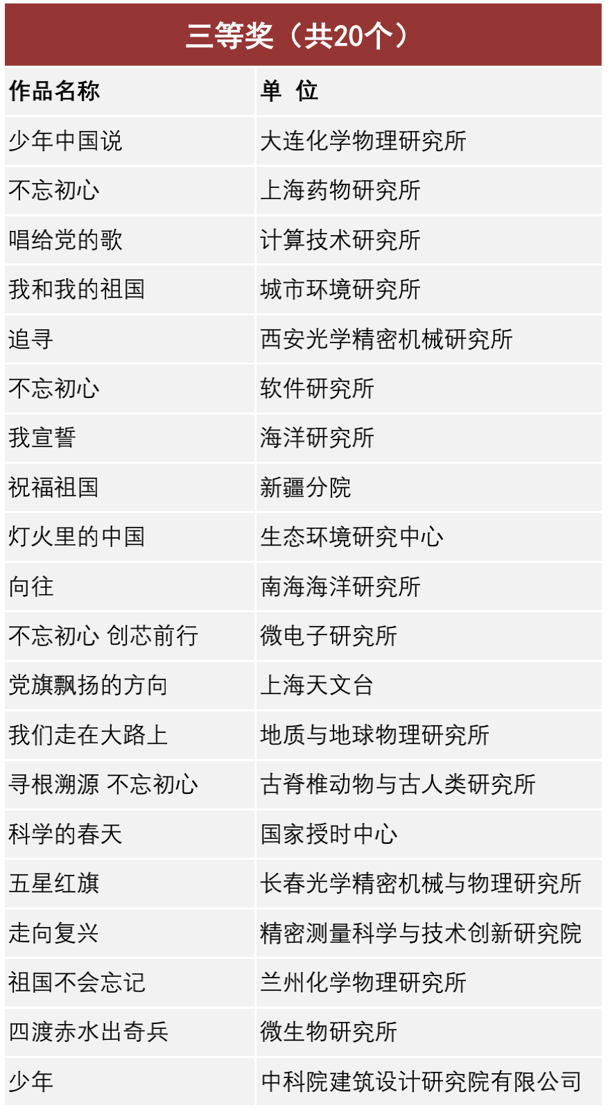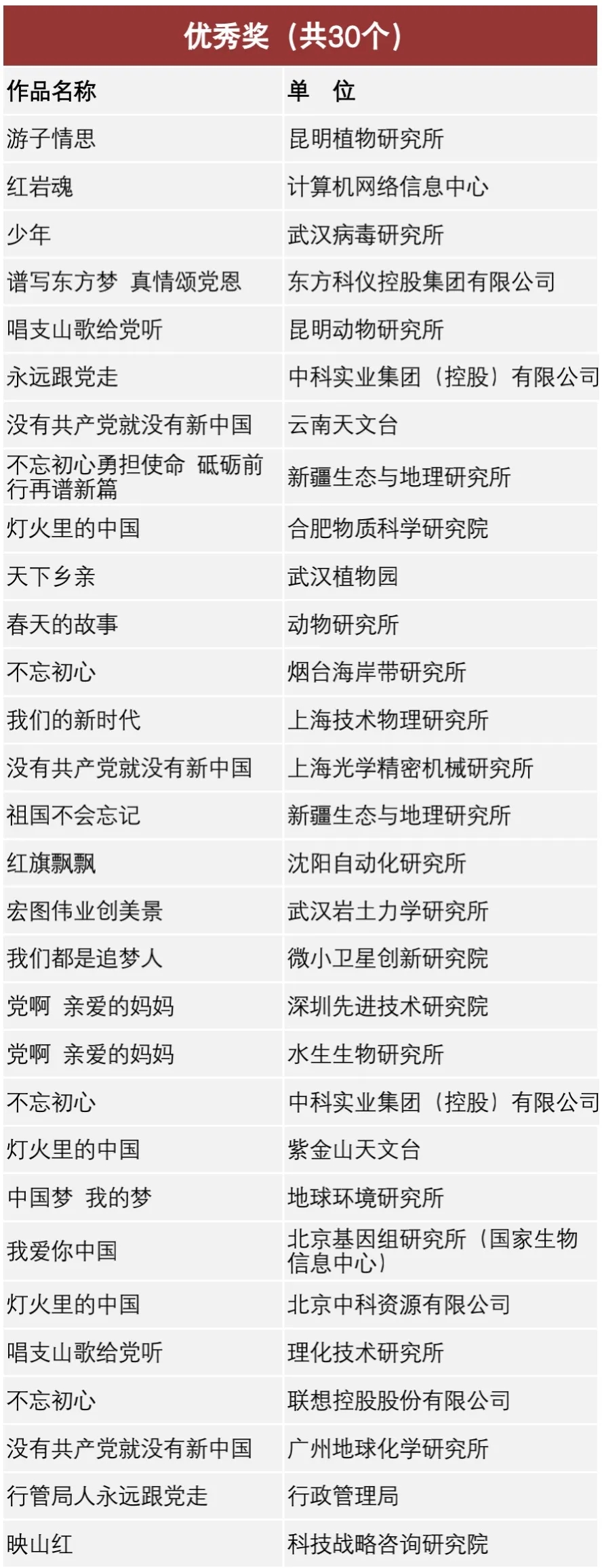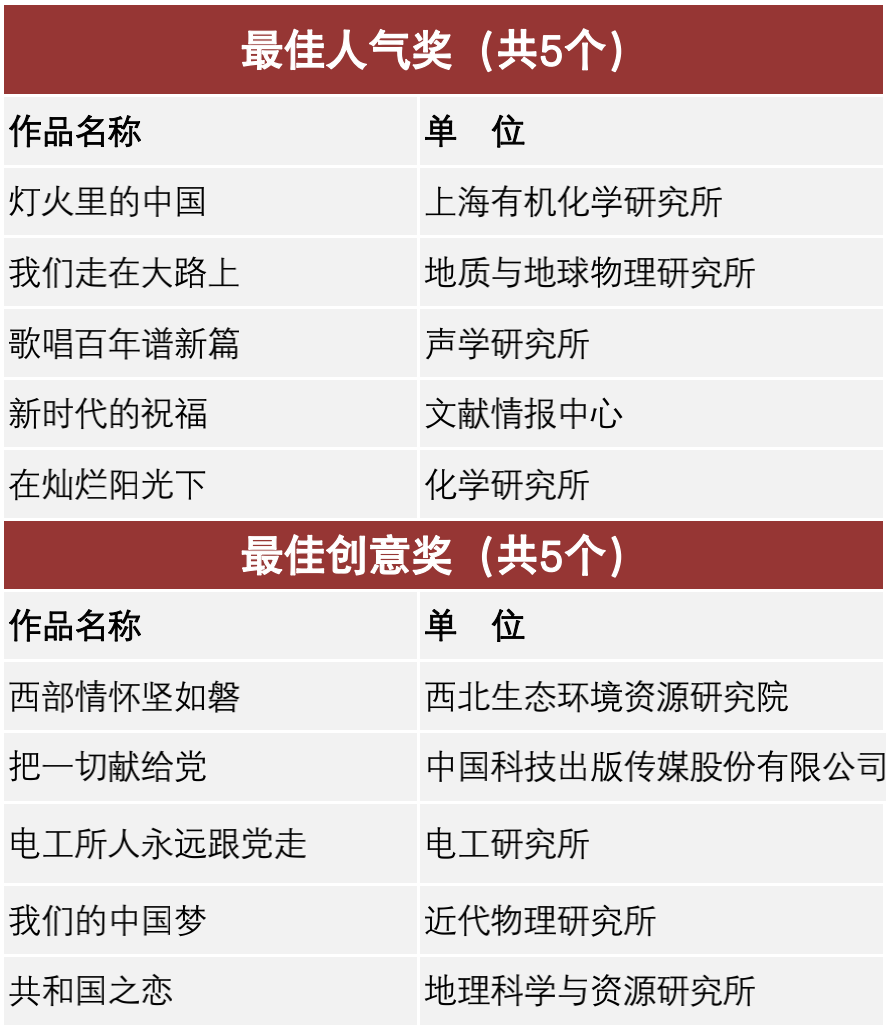 自活动启动以来,院属各单位高度重视、精心组织,以歌抒怀、以咏言志,共提交125件参赛作品。经专家评审,共评选出一等奖10个,二等奖15个,三等奖20个,优秀奖30个。所有参赛作品进行了在线展播和投票,根据网络投票结果并结合专家意见,评选出最佳人气奖5个,最佳创意奖5个。