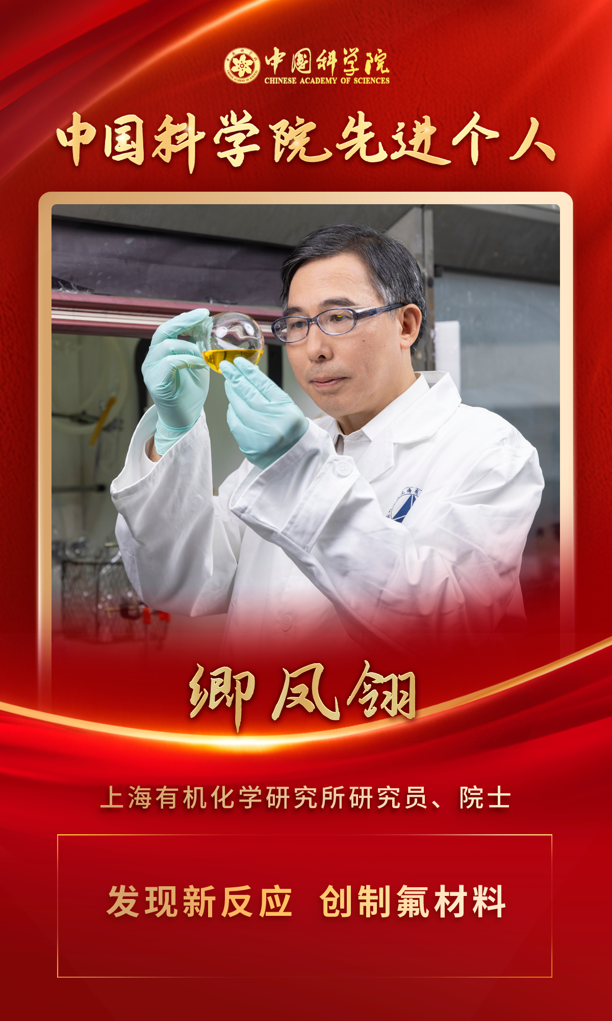 卿凤翎同志始终胸怀“国之大者”,自觉将科研方向与国家战略需求紧密结合,原创性提出“氧化三氟甲基化”新概念,发展为重要的合成工具“卿氟化反应”,实现了基础研究的引领突破;成功研制出保障惯性导航自主可控的“氟溴醚油”,打破国外对耐极端环境氟醚橡胶的垄断;成功研制出几十种不同用途的耐空间环境有机热控涂层和膜材料,应用于载人航天、探月工程等重大任务,有力支持了我国航空航天等高新技术产业的相关需求。他治学严谨,立德树人,培养博士50余名,带出了一支富有创新活力的科研团队。