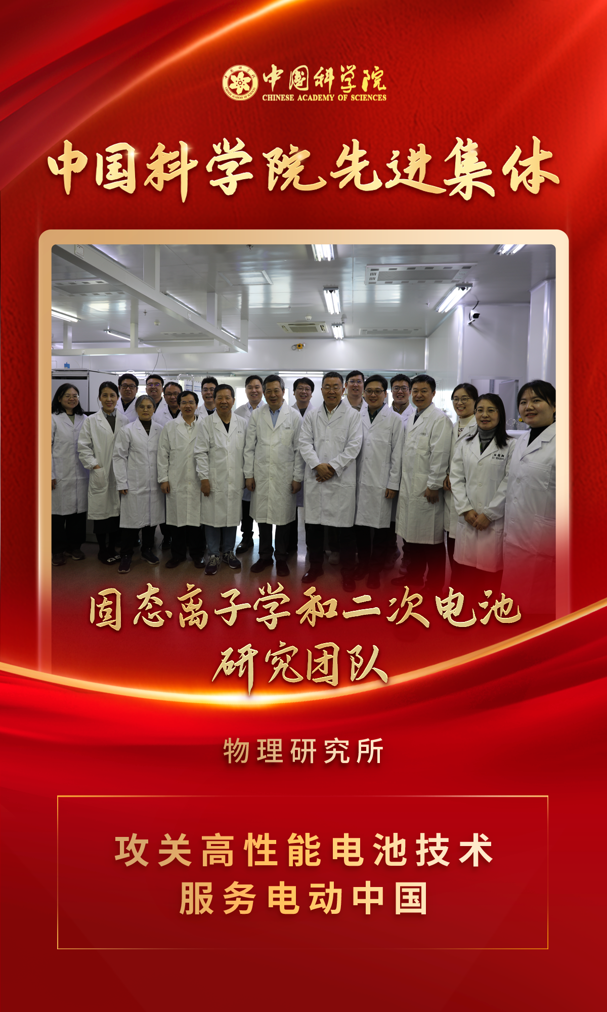 团队几十年来始终以科技强国为己任,发扬科技报国、爱国奉献的优良传统,攻坚克难、开拓创新,创立了中国固态离子学学科,推动了锂电池从无到有的进程;围绕关键电池材料创新研究,获得多项重要专利成果,打破国外专利壁垒,实现了核心材料自主可控;引领布局新一代固态电池及钠离子电池,确保我国电池领域的持续领先。参与工信部创新工程重大任务,承担固态锂电池技术攻关,围绕长续航,高安全固态电池在新能源汽车领域的应用展开突破,全力抢占动力电池科技制高点;参与中国科学院抢占科技制高点重大科技任务,承担钠电池储能项目,围绕我国钠电池在中长时储能领域的应用展开技术攻关,全力以赴按照任务节点实现突破。