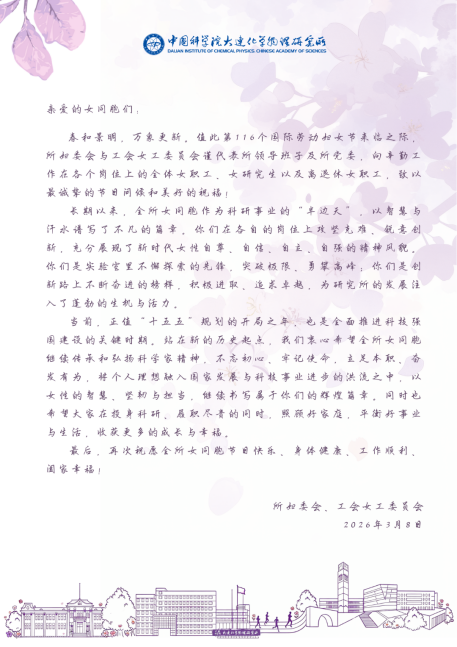 3月6日,为在所内营造浓厚的妇女节节日氛围,我所在所网站发布《致全所女同胞“三八妇女节”慰问信》。慰问信中,所领导班子、所党委向一直以来为我所各项工作高质量发展作出卓越贡献的广大女性科技工作者,致以最诚挚的节日问候和衷心祝福。同时,在我所微信公众号等新媒体平台推出优秀女性科技工作者专题宣传,以她们为典型,鼓励广大女性科技工作者自尊自信展示巾帼风采,自立自强谱写精彩华章,为研究所发展创造新业绩。
