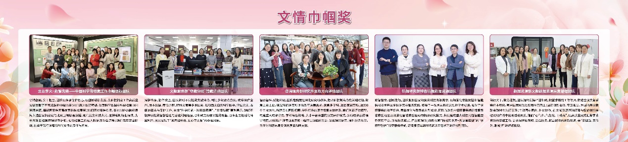 文献中心开展了第二届“文情巾帼”优秀团队评选活动,最终从11个申报团队评选出5个优秀团队。这些团队符合“团队主要负责人为女性,团队成员女性比例在60%以上”的评选条件。团队成员立足本职、勇挑重担,在文献数据资源采购、特色情报研究、科研评估、馆藏清点、全院档案建设等领域做出了突出贡献,取得了优异成绩。