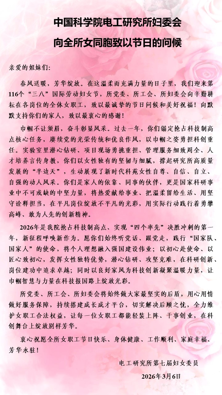 “三八”国际劳动妇女节前夕,电工所妇委会向全体女职工致以节日祝福与问候。致敬在过去一年中,各位女同胞在科研、管理、服务等岗位勇担重任、细致奉献,以坚韧担当撑起研究所高质量发展 “半边天”,展现了新时代科苑女性自尊自信自立自强的风采。鼓励全体女职工在新的一年,听党话、跟党走,践行 “国家队、国家人” 使命,立足岗位潜心钻研、岗位建功,以良好家风助力科技创新,在科技报国征程中绽放巾帼光彩。