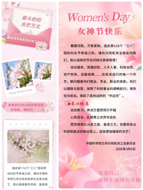 节日当天,兰州分院系统工会为系统全体女职工送上了温馨寄语,机关工会为机关全体女职工发放了电子贺卡,祝愿她们无论在科研路上还是生活中都行而不辍、自绽芳华。