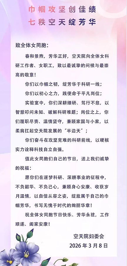 节日温情致敬,共庆七秩华诞。3月7日,为全体女职工送上定制鲜花。鲜花承载着节日的美好祝福,传递了单位对女职工的深切关怀,让每一位女职工感受到身为空天人的荣誉感与归属感,收获了专属的节日仪式感。同时,空天院官方公众号发布“巾帼攻坚创佳绩 七秩空天绽芳华”主题推文,致敬每一位在岗位上默默奉献的空天巾帼,彰显空天院的人文温度与特色底蕴。