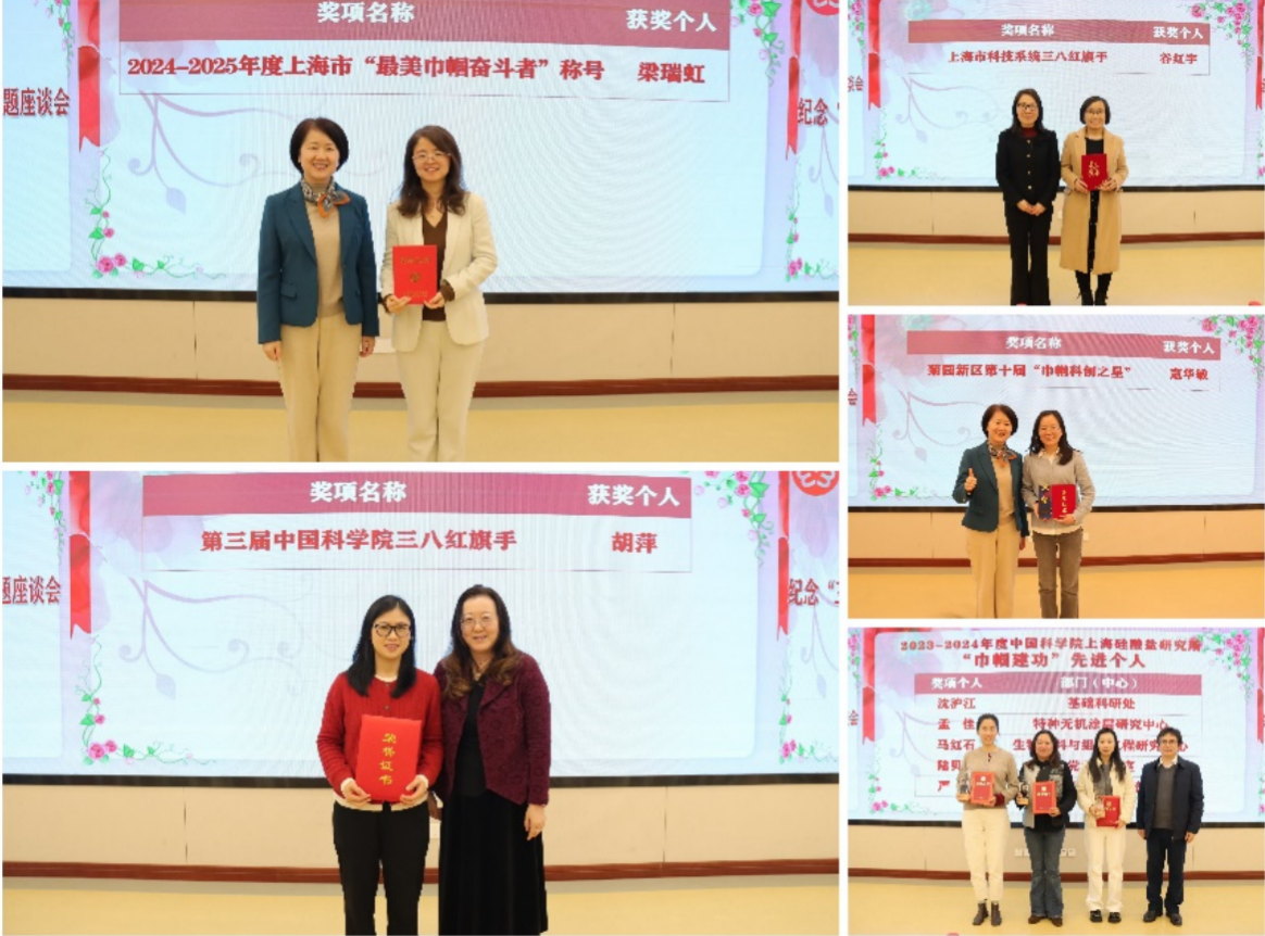在3月11日的座谈会上,隆重表彰了2024-2025年度上海市“最美巾帼奋斗者”、第三届中国科学院三八红旗手、上海市科技系统三八红旗手、菊园新区第十届“巾帼科创之星”以及2023-2024年度研究所“巾帼建功”先进个人等。