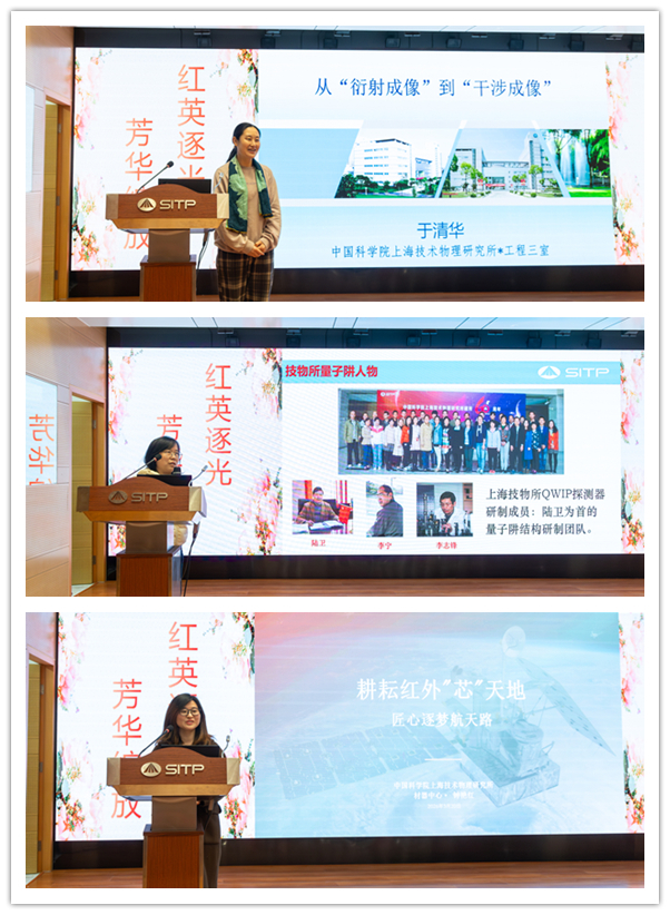 工程三室于清华研究员深耕空间光学遥感领域近二十年,她以《从像面直接成像到干涉计算成像》为题,讲述在成像机理层面的重要技术跨越,用坚持诠释科研路上每一步扎实的探索;红外器件室王玲副研究员长期从事量子阱探测器研制,她带来《量子阱探测器的二三事》,传递“科技创新的路上,没有白费的努力,每一步都算数”的信念;材器中心钟艳红副研究员扎根碲镉汞红外焦平面研发一线十五年,她以《耕耘红外“芯”天地,匠心逐梦航天路》为题,分享为空间光电载荷造芯的匠心追求。